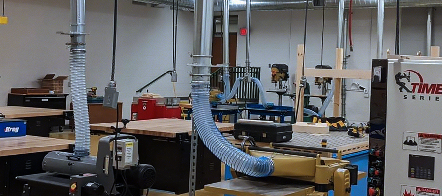 Wood dust is a simple and obvious indoor air quality problem with an easy remedy. Minimally, wood dust is an eye and respiratory irritant. In the worst case, indoors, under certain conditions, wood dust is an explosion and fire hazard. In every case, wood dust is a cleanup problem. Wood dust was a chronic problem in this eastern Nebraska High School. The variety of common wood shop tools – saws, planers, routers – spew dust daily. Students and instructors needed a solution that was both effective and compliant with various regulations and standards, such as those put forth by the NFPA (National Fire Protection Association).