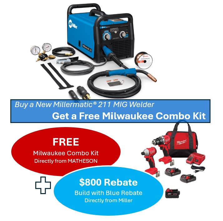 Buy a new Millermatic 211 (907614, 951603) and receive a FREE Milwaukee Combo Kit.