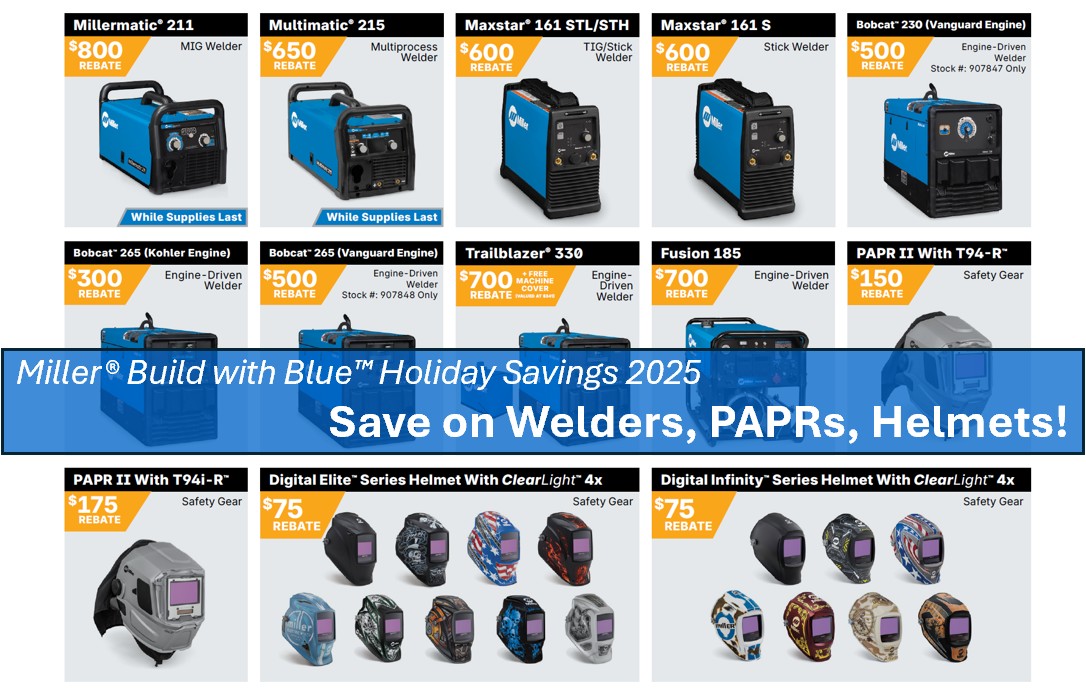 Build with Blue Holiday Savings are valid October 1 through December 31, 2025, while supplies last, and are subject to Miller Electric’s Terms and Conditions.
