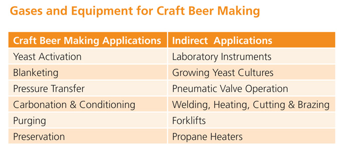 - Gases also support craft brewing in applications such as in the lab, brewery maintenance, equipment fabrication and repair, power generation, forklift fuel, and HVAC