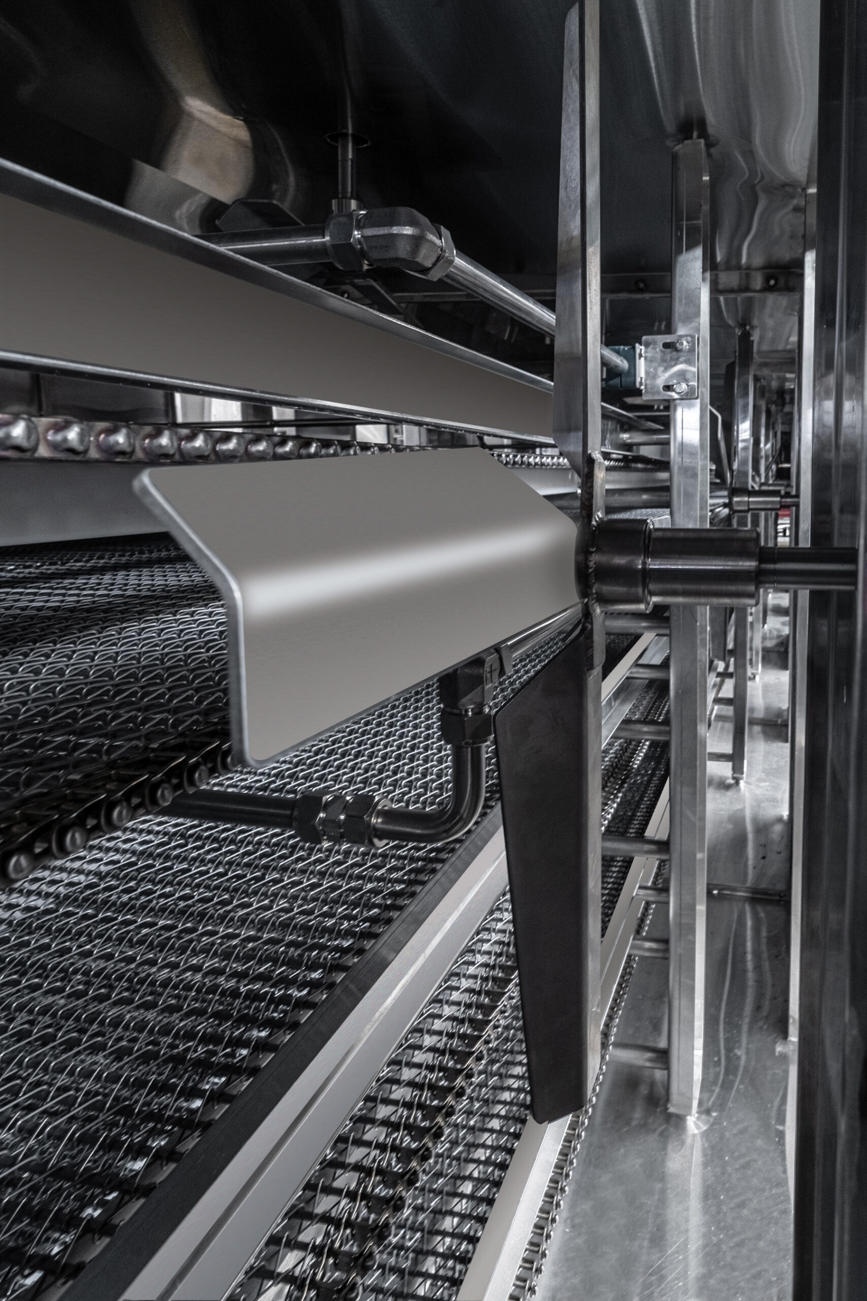 Ideal for IQF (individual quick freeze) of small food products, a flighted freezer uses three or more short belts that are inclined at an angle to induce product tumbling during the freezing process. The motion of the food products reduces the probability of the items freezing together, and enables IQF of items such as berries, diced meats, and vegetables.
